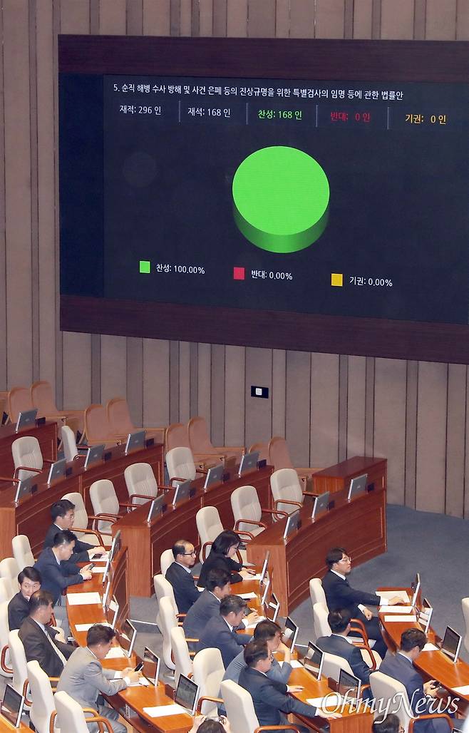 | ▲ 채상병특검법 국회 통과 채상병특검법이 2일 국회 본회의에서 국민의힘 의원들이 퇴장한 가운데 재석 168인 중 찬성 168인 반대 0인으로 통과되고 있다. |