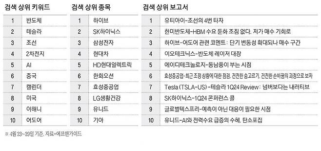 한 주간 투자자들의 이목이 쏠렸던 종목은 하이브와 SK하이닉스, 그리고 삼성전자였던 것으로 나타났다. 키워드 검색 순위에서는 '부동의 1위' 반도체가 이번에도 가장 높은 순위를 유지했고, 2위와 3위는 각각 테슬라와 조선이었다. 보고서 순위에서는 폴더블 커버 윈도 기술업체인 유티아이 관련 보고서가 1위였으며 2위는 한미반도체 관련 보고서였고, 종목 검색 순위 1위를 차지한 하이브 관련 보고서가 3위였다.