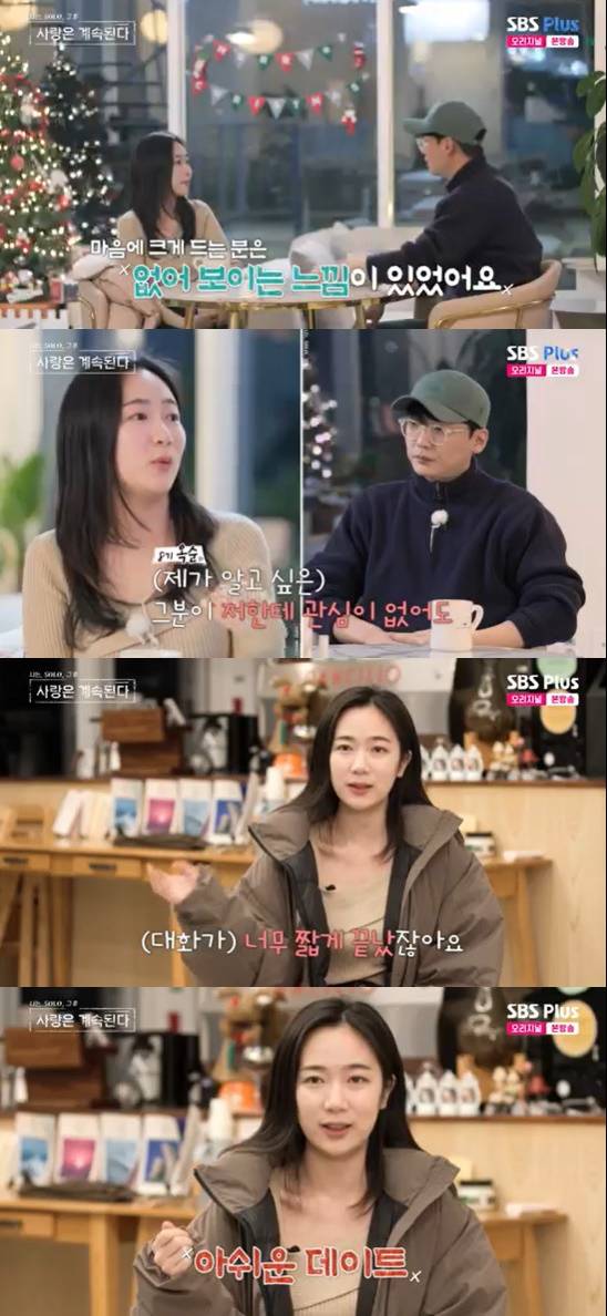 그러면서 "그래도 오늘은 내가 궁금하니까 알아보고 싶었다. 상대가 나한테 호감이 없어 보여도 대화를 해보겠다고 마음 먹었었다"라며 데이트할 때의 마음 가짐을 전했다.