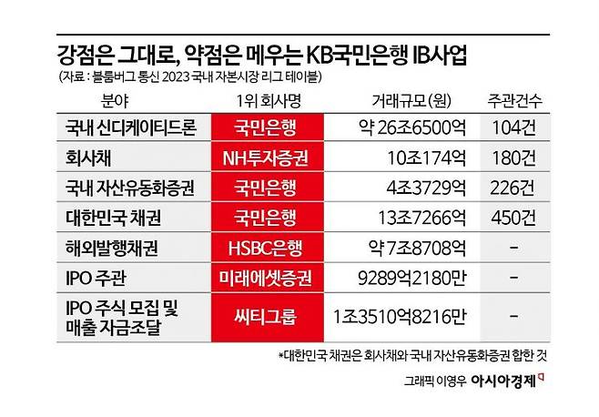 국민은행은 글로벌 IB 사업 강화를 통해 사업 다각화를 노리고 있다. 국내 시장에선 1~2위를 다투고 있지만 글로벌 시장에선 상업은행을 넘어 투자은행으로서의 리딩뱅크가 돼야 한다는 것이다. 이를 위해 블랙스톤, 칼라일, 맥쿼리 등 87개 운용사와 네트워크를 확보해 협업을 진행하고 있다. 그 결과 지난해 블룸버그 통신 자료에 따르면 국내 신디케이티드론, 자산유동화증권, 대한민국 채권 분야에서 1위를 기록했다. 회사채 발행에선 2위를 차지했다. 다만 해외발행채권과 IPO 분야에선 순위권에 들지 못했다.