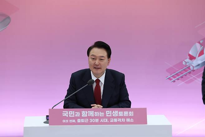 | ▲ 2024년 1월 25일, 윤석열 대통령이 경기도 의정부시청 대강당에서 열린 '국민과 함께하는 민생토론회 - 여섯 번째, 출퇴근 30분 시대, 교통격차 해소'에서 발언하고 있다. |