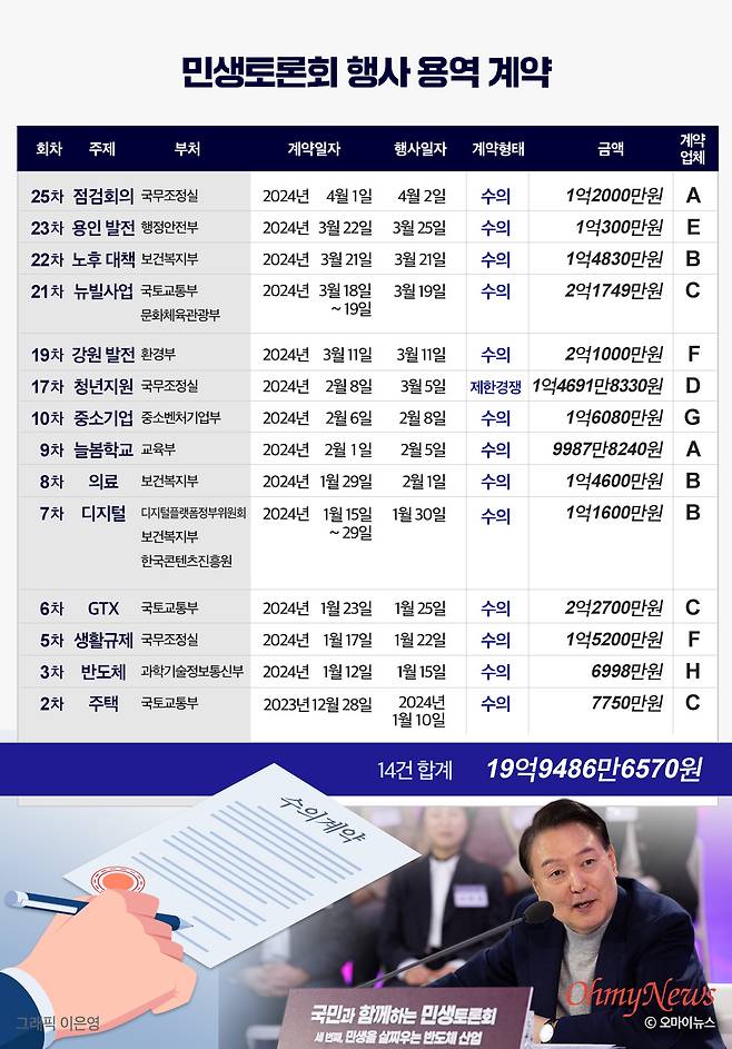 <오마이뉴스>가 확인한 14번의 민생토론회 계약 건은 발표자료 제작 용역 등을 뺀 행사 개최 용역만 총 19억 9486만 원으로, 1회당 평균 1억 4249만 원 꼴이었다. 따라서 자료 제작 용역 비용까지 포함될 경우 1회당 비용은 더 올라갈 가능성이 있다.