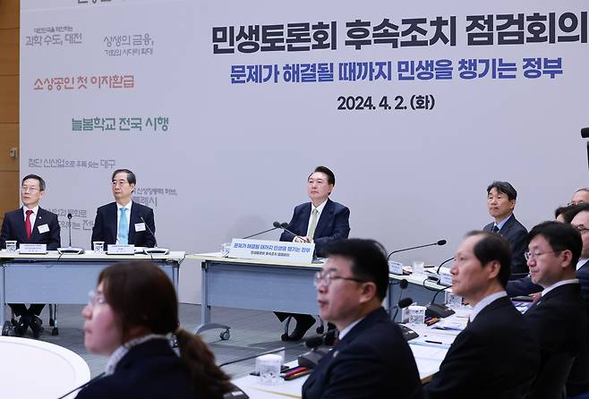 | ▲ 윤석열 대통령이 2일 정부세종청사에서 열린 민생토론회 후속 조치 점검 회의에 참석해 방기선 국무조정실장의 후속 조치 추진 현황 발제를 듣고 있다. 2024.4.2 |