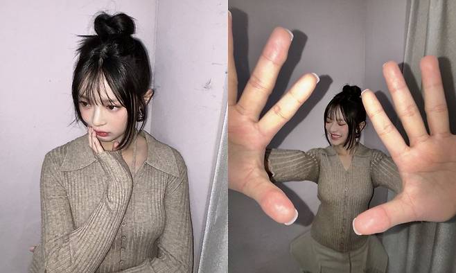 공개된 사진 속에는 묶음 머리를 하고 있는 하니의 모습이 담겼다. 턱에 손을 댄 채 생각에 잠긴 표정을 지은 그는, 이후 눈을 질끈 감고 미소를 지으며 두 손바닥을 카메라에 가까이 가져다대고 있다. 사랑스러운 하니의 모습에 시선이 쏠리고 있다.
