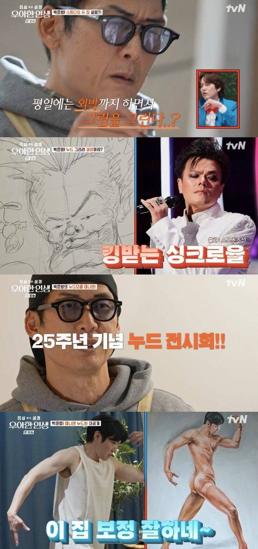 특히 이날 박준형은 누드화를 그리고 싶다며 과외 선생님과 함께 JYP 박진영 그리기에 도전했다. 10년 이상 함께한 만큼 박진영 특징을 잘 알고 있는 박준형은 순식간에 헐벗은 박진영을 완성했다. 완벽한 싱크로율에 패널들은 감탄할 정도. 이윽고 박준형은 누드 모델로 god 데니안을 초대했다. 아무것도 모르는 데니안에 박준형은 god로 한창 활동하던 시절 찍었던 표지 모델을 자연스럽게 언급했다. 실제 god는 표지를 찍을 당시 옷을 벗으라고 해서 옷을 벗고 찍었다고.