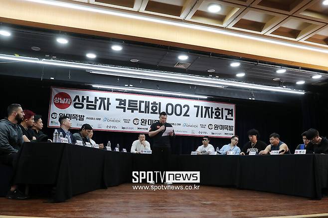 4일 서울 논현2문화센터에서 열린 '상남자 격투대회 002' 기자회견은 출전 선수들이 한자리에 모여 상대 선수와 기싸움을 하는 자리. 유튜브 영상을 통해 서로를 강하게 도발해 오던 메인이벤터 성명준(33)과 김중우(31) 사이 스파크가 너무 강하게 튀지 않을까 걱정하면서도 기대하는(?) 팬들이 많았다.