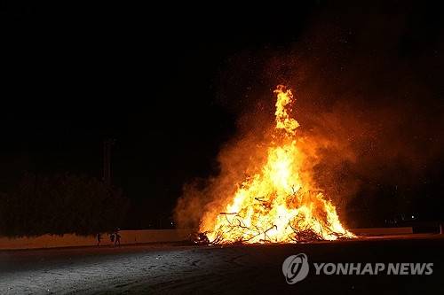 Young men walk next to a bonfire during Christian Orthodox Easter celebrations in Xylophagou village in the southeast of the island of Cyprus, Saturday, May 4, 2024. Cypriots lit the traditional Easter bonfires, or lambradjia, as it is known in Cyprus, where they burned effigies of Judas Hiscariot, the disciple thought to have betrayed Jesus. (AP Photo/Petros Karadjias)