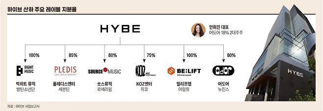 지난해 말 기준 민 대표가 보유한 어도어 지분은 18%다. 민 대표 지분이 늘어난 것은 어도어 매출이 급증한 지난해. 민 대표는 어도어 설립 당시(2021년) 약속받은 지분 10%에 현금 특별상여에 해당하는 5% 지분을 추가로 받아내며 15% 보유 주주가 됐다. 이후 측근 지분 2%를 포함한 추가 지분 5%도 받았다.