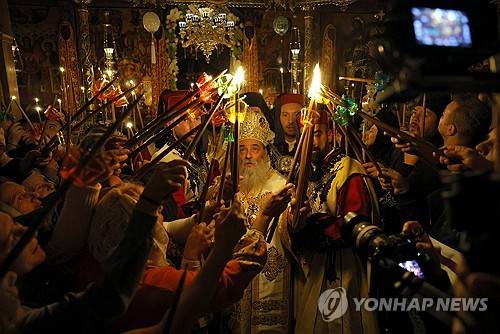 epa11319020 Orthodox pilgrims light candles from the torches burning with the Holy Fire from Jerusalem during the Orthodox Christian Easter service led by Bishop Partenie (C) at the 10th-century monastery of St. John the Baptist (Sv. Jovan Bigorski) near Mavrovo, Republic of North Macedonia, 05 May 2024. North Macedonia's Orthodox church celebrates Easter by the Julian calendar. EPA/GEORGI LICOVSKI