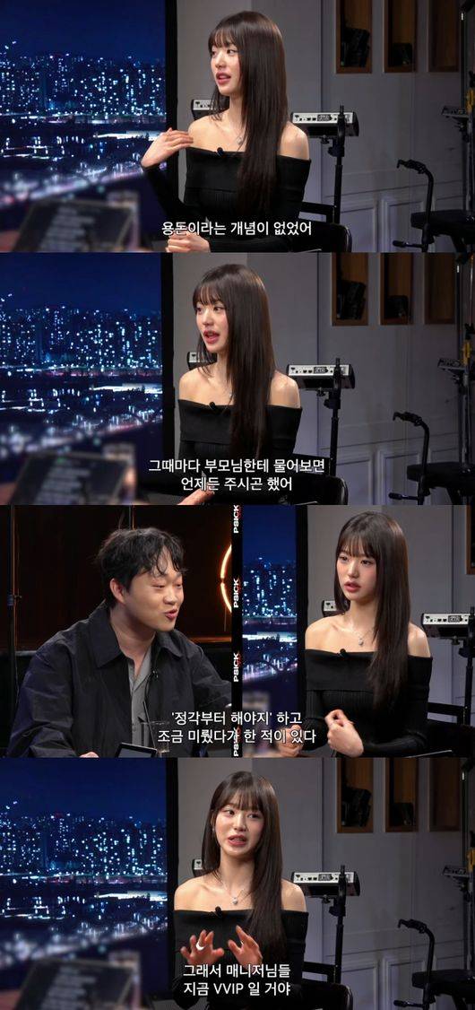 '부모님 지갑에 손 대본 적 있냐'는 질문에 장원영은 “없다. 달라고 하면 주시는데 왜 훔치냐. 매번 달라고 하면 용돈을 주셨다"고 답했다. 그러면서 “사실 용돈이라는 개념이 어릴 때에 없었다. 무언가 원하거나 필요할 때 부모님께 물어보면 언제든 주셨다. 그래서 용돈이 없었다"고 설명했다. 이를 들은 민수는 "나도 부모님 이해간다. 나도 원영이같은 딸 있으면 내 모든 걸 줄 수 있다”라고 공감해 웃음을 안겼다.