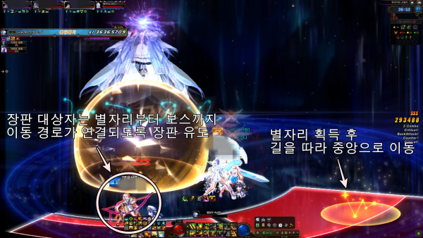 장판 대상자는 별자리를 보스까지 전달할 수 있도록 길을 연결하는 역할이다. 별자리 위치부터 보스까지 이동 경로가 연결되도록 장판을 유도해야 한다.