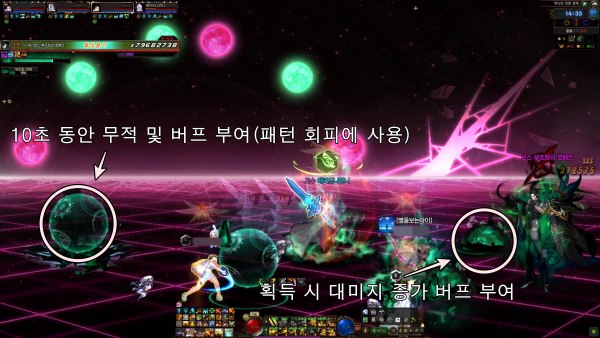 해당 구체가 2페이즈의 핵심이다. 초록 구체는 기본 공격으로 파괴 시 10초 동안 무적 및 버프를 준다. 2페이즈 광폭화 패턴 대부분이 마지막에 피할 수 없는 즉사급 대미지를 주기 때문에 해당 구체를 획득해 무적으로 생존해야 한다.