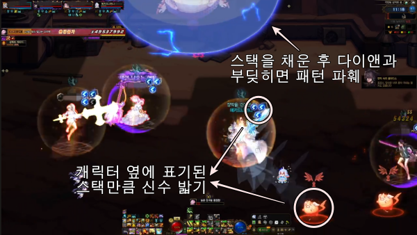 다이앤이 맵 상단으로 이동해 전멸기를 시전한다. 플레이어는 캐릭터 옆에 표기된 스택 수만큼 소형 신수를 밟아 스택을 채우고 다이앤과 부딪혀 카운트 수를 줄여야 한다. 다이앤은 패턴 중간에 플레이어를 향해 번개 장판을 시전한다. 매우 강력하니 다이앤과 부딪힐 때 주의하자.