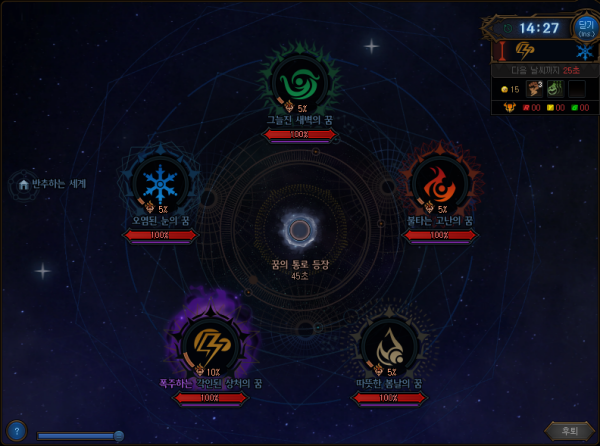 보스의 체력을 10% 깎으면 던전 속성에 맞는 '오행의 기운'을 획득한다. 꿈의 통로 중앙에 위치한 '에르곤의 곡옥'에 오행의 기운을 주입(TAP 키)하면 다른 던전의 광폭화 게이지를 낮출 수 있다.