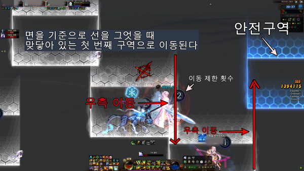 현재 위치한 사각형의 면을 기준으로 선을 그었을 때 맞닿아 있는 첫 번째 사각형으로 이동된다. 위 이미지를 기준으로 우측으로 2회 이동 또는 위로 1회 이동하면 안전 구역에 도착한다.