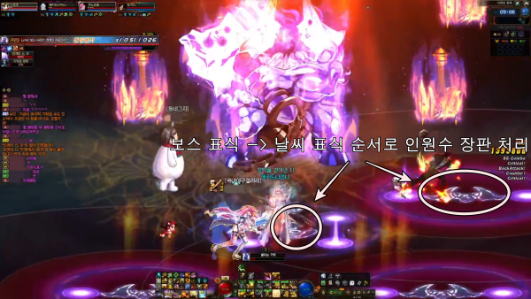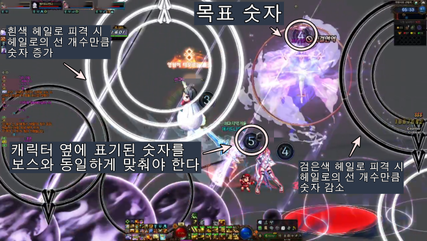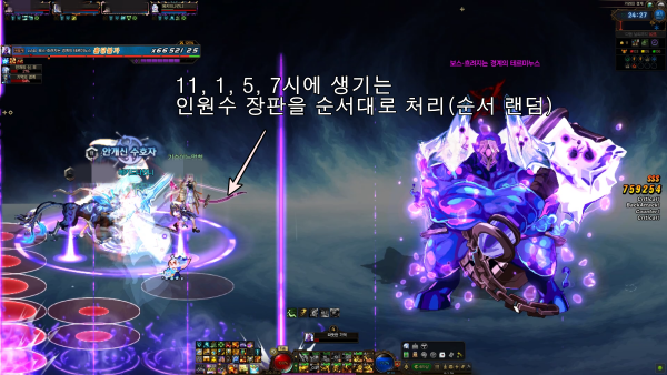 11, 1, 5, 7시에 인원수 장판이 생성된다. 생성 위치는 랜덤이며, 인원수 장판을 처리할 때마다 한 명씩 구체에 감금된다. 다음 인원수 장판 위치는 감금 구체가 날아가는 방향을 보고 파악하면 된다.