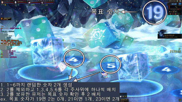 3명의 파티원에게는 1부터 6까지 숫자 중 랜덤한 2개 숫자가 주어진다. 주어진 숫자 중 1, 3, 4, 5, 6을 각 주사위에 하나씩만 배치하면 된다. 이 때 2를 보유한 유저 역할이 중요하다. 등장하는 목표 숫자는 19, 21, 23이므로 목표 숫자에 따라 2를 아예 배치하지 않거나 1개 또는 2개를 배치해야 한다.