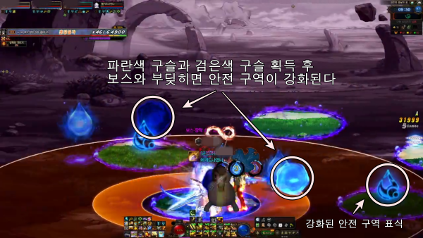안전 구역을 강화하지 않으면 패턴 종료 시 안전 구역이 모두 사라지고 전부 사망하기 때문에 최소 4개의 안전 구역을 강화해야 한다. 안전 구역은 파란색 구슬과 검은색 구슬 획득 후 보스에게 부딪히면 강화된다. 1번과 2번, 3번과 4번 플레이어가 각각 구슬 색상을 분담해 처리하는 것을 추천한다.