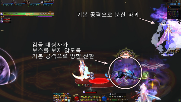 랜덤한 대상자를 감금 상태로 만들고 다수의 분신을 소환한다. 분신을 모두 파괴한 상태에서 최종적으로 보스를 보지 않으면 파훼된다. 분신의 위치는 일정 거리 접근 시 확인할 수 있으며, 패턴 마지막에 감금 대상자가 보스를 보지 않도록 기본 공격으로 방향을 전환해 줘야 한다.