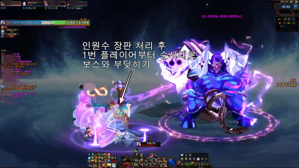 좌 또는 우측에서 굴러오는 인원수 장판을 처리하면 파훼된다.