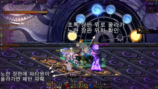 맵을 기준으로 두 명씩 좌우로 나뉘어 인원수 장판을 처리하면 파훼된다. 기존 인원수 장판과 달리 점프로 처리해야 한다.