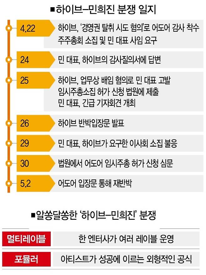 # 하이브와 민희진 어도어 대표의 갈등이 점입가경이다. 하이브의 성장을 함께 일구던 양측은 강하게 충돌하고 있다. 하이브는 민희진 대표가 어도어의 경영권 찬탈을 획책했다며 감사에 착수했고 이를 언론에 알렸다. 3일 뒤 민희진 대표는 긴급 기자회견을 열고 "경영권 찬탈 시도는 없었고, 내부고발을 하자 반격당한 것"이라 반박했다.