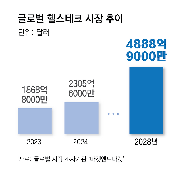 6일 글로벌 시장 조사기관 마켓앤드마켓에 따르면 헬스테크의 세계 시장 규모는 올해 2305억6000만 달러(약 314조 원)에서 연평균 20.7%씩 성장해 2028년 4888억9000만 달러(약 666조 원)로 성장할 것으로 전망된다.