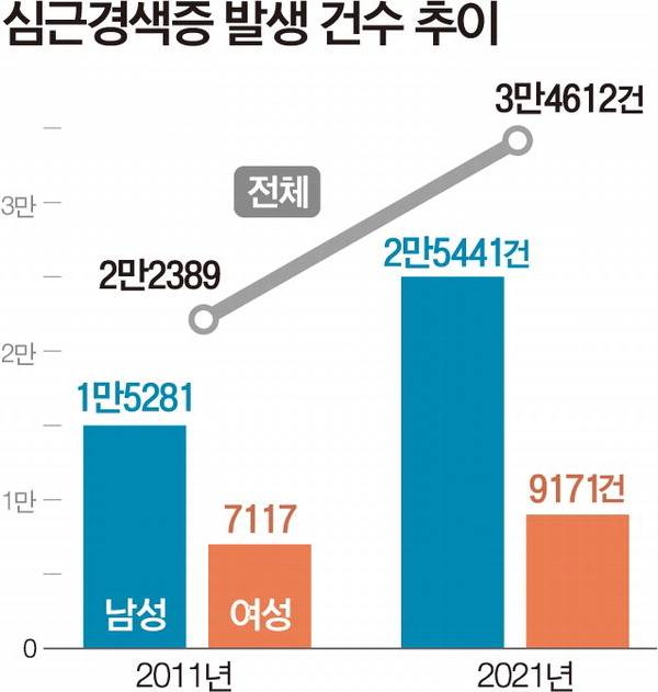 우리나라에서 돌연사를 부르는 심근경색증 환자 발생 건수는 2021년 3만4612건으로, 10년 전인 2011년 2만2398건보다 1.5배 늘어난 것으로 나타났다. 이 가운데 남자가 여자보다 2.8배 더 많았다.
