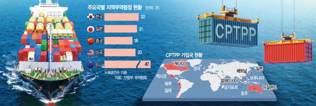 국제통상 전문가들은 경제 안보가 위협 받는 상황에서 야당의 전향적인 태도를 주문했다. 산업부와 무역협회 등에 따르면 지난해 기준 주요국의 지역무역협정(RTA) 체결 건수는 유럽연합(EU)이 47건으로 가장 많았다. 이어 한국(22건), 일본(21건), 미국(20건), 중국·호주(18건), 캐나다(16건) 순이었다. 한국이 건수로는 뒤지지 않지만 CPTPP처럼 공급망 안정과 시장 확대에 필수적인 협정에 가입하지 않으면 실효성이 떨어지기 때문이다.
