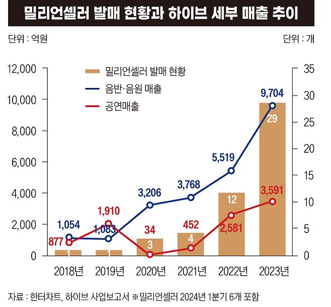 이에 비해 음반·음원 매출은 더 큰 폭으로 늘었다. 2019년 1083억원에서 2020년 3206억원으로 급격히 늘었다. 그 후 2021년 3768억원, 2022년 5519억원, 2023년 9704억원으로 1년 새 두 배씩 늘어나는 추세다.