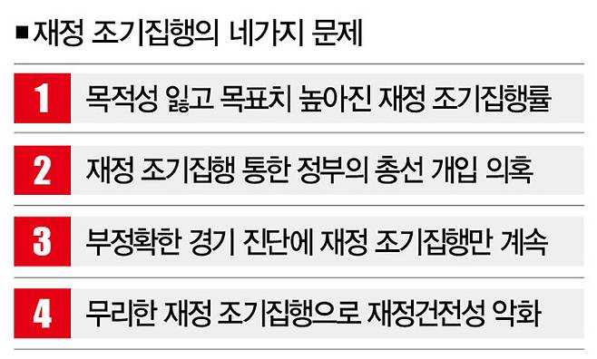 재정 조기집행. 중앙정부 재정사업의 집행(지출)액 상당분을 그해 상반기에 사용하는 제도다. 그해 경기 전망이 '상저하고'일 때 유용하게 사용할 수 있다. 상반기에 재정을 풀어 경기활성화를 유도할 수 있어서다. 문제는 재정 조기집행이 '정치화'하고 있다는 점이다. 올 4ㆍ10 총선 직전인 3월에 정부의 '재정 조기집행률'이 높아진 건 그래서 따져봐야 한다.
