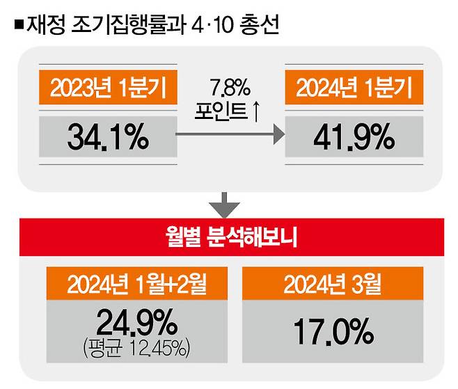 둘째는 재정 조기집행에 총선이라는 특수한 상황이 영향을 미친 것으로 보인다는 점이다. 언급한 것처럼 올해 재정 조기집행률 목표치는 65.0%다. 지난해와 목표치가 같다. 그런데 올해 1분기 재정 조기집행률은 41.9%로, 지난해 1분기(34.1%)보다 7.8%포인트 더 높았다. 올해 1분기에 재정 조기집행이 집중적으로 이뤄졌다는 거다.