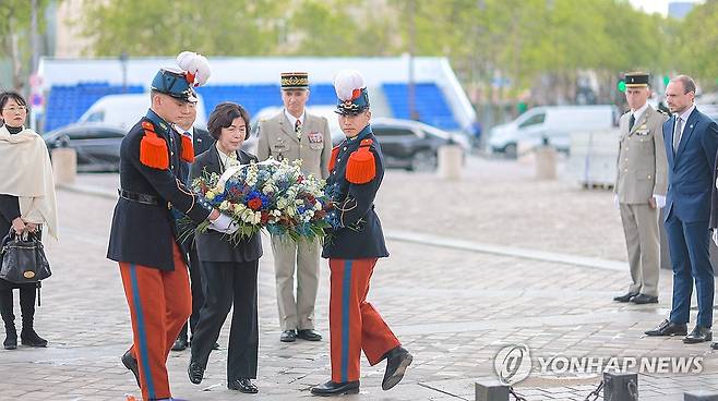 (서울=연합뉴스) 프랑스와 독일을 방문 중인 강정애 국가보훈부 장관이 6일(현지시간) 오전 프랑스 파리 개선문 광장 무명용사의 묘를 방문, 헌화하고 있다. 2024.5.7 [국가보훈부 제공. 재판매 및 DB 금지]