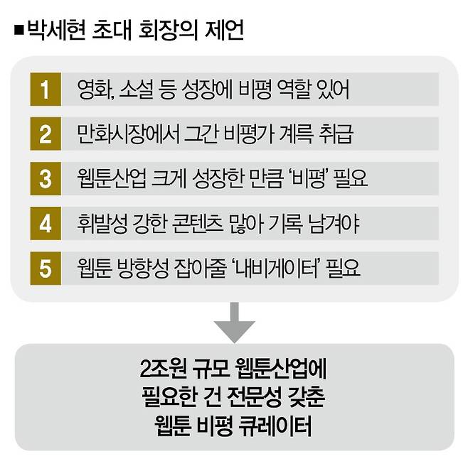 "웹툰산업이 성장하면서 비평가들이 해야 할 일도 많아졌습니다. 비평의 영역도 다각화했으니까요. 그래서 협회를 만들 때 다양한 관점의 비평가를 모셨습니다. 지금 협회엔 역사론ㆍ작가론ㆍ정책론ㆍ작품론ㆍ산업론 등 다양한 관점에서 웹툰산업의 변화를 다루는 비평가들이 있습니다."