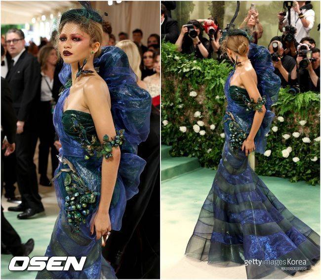 젠데이아는 5년 만에 선 '멧 갈라' 무대에서 메탈릭 공작 색상의 메종 마르지엘라 바이 존 갈리아노 드레스를 착용했다. 깃털 장식이 인상적인 블루와 그린 바이어스 컷 드레스는 인어 꼬리와 포도 장식이 특징이다. 젠다이아는 크리스찬 루부탱이 맞춤 제작한 타비 펌프스를 신고 자신의 룩에 멋을 더했다.