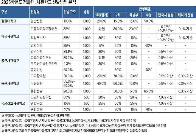 경찰대, 사관학교는 학교별·전형별로 전형 요소 반영 비중에서 약간의 차이가 있지만 큰 틀에서 1차 필기시험, 2차 체력 평가 및 면접, 그리고 학생부 및 수능 성적을 합산해 선발하는 방식은 비슷하다. 사관학교는 한국사 검정시험과 체력 평가에 가산점을 준다. 예컨대, 육군사관학교 고교학교장추천 전형은 최종 성적 계산 시 한국사 검정시험 성적에 0.07~0.3%까지 가산점을 주고, 체력 평가에 대해선 0.1% 가산점을 부여한다.