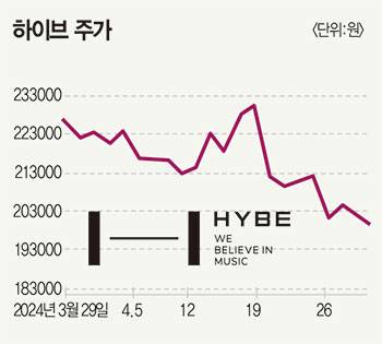 집안싸움에 하락세를 보인 하이브 주가가 쉽게 회복되지 않는 모습이다. 지난 5월 2일 기준 종가는 20만원. 하이브와 어도어의 난타전이 시작되기 전인 4월 19일(23만500원) 대비 14.9% 떨어졌다.