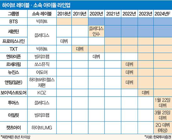 BTS 출현 등으로 K팝 시장 외연이 대폭 확장되면서 제대로 된 멀티 레이블 시스템을 시도할 만한 여건이 마련됐다는 게 다수 전문가 시각이다. 그 중심에 BTS라는 슈퍼스타를 앞세운 하이브가 있다는 데 이견이 없다. 상장으로 조달한 막강한 자본력을 지렛대 삼아 하이브는 국내외 엔터 시장에서 공격적인 다각화로 ‘범위의 경제(Economies of Scope)’ 구현을 노렸다. 기존 레이블 지분 매입과 신규 레이블 설립, 지분 투자 등이 숨 가쁘게 이뤄졌다. 세부적으로 ‘방탄소년단’은 빅히트뮤직, ‘세븐틴’은 플레디스, ‘르세라핌’은 쏘스뮤직, ‘뉴진스’는 어도어에 각각 속해 있다. 하이브는 미국·일본 아티스트용 레이블도 따로 뒀다. 세계적인 가수 아리아나 그란데와 저스틴 비버가 소속된 이타카홀딩스도 하이브 완전 자회사 하이브아메리카 소속이다.