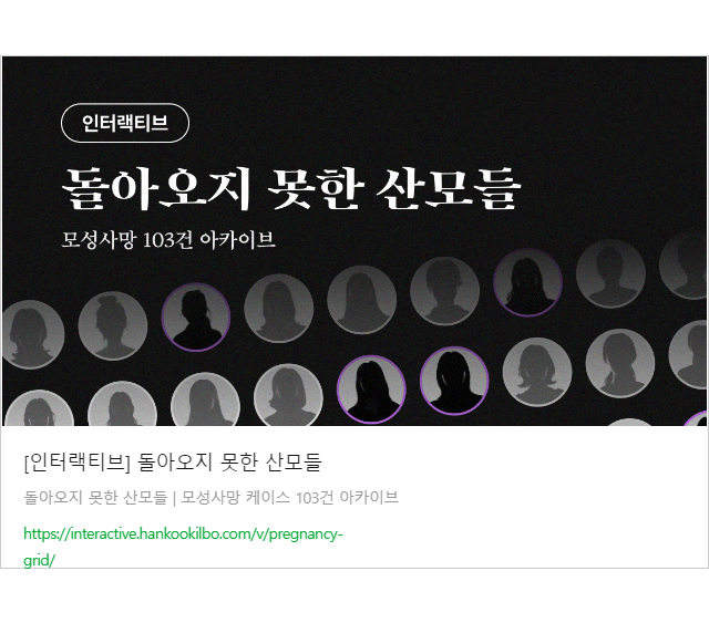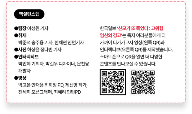 ▶돌아오지 못한 산모들: 모성사망 103건 아카이브 인터랙티브 기사도 읽어보세요. 산모가 출산 중 왜 사망했는지 객관적 상황들과 유족 13분의 이야기를 담았습니다. 제목이 클릭이 안 되면 아래 주소를 입력하세요. https://interactive.hankookilbo.com/v/pregnancy-grid/