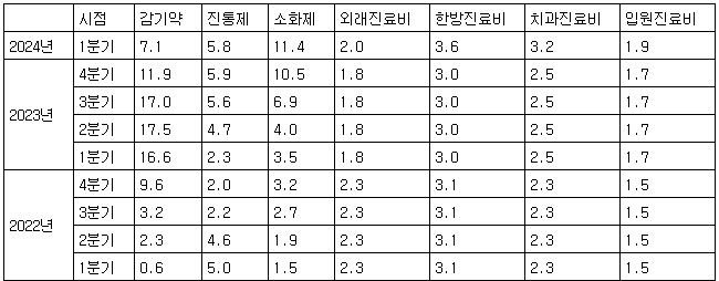 [표] 분기별 진료비·의약품 물가 증감률 (전년동기대비·%)