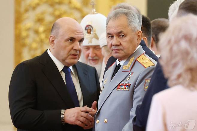 (모스크바 AFP=뉴스1) 우동명 기자 = 미하일 미슈스틴 러시아 총리와 세르게이 쇼이구 국방장관이 7일(현지시간) 모스크바 크렘린 궁에서 열린 블라디미르 푸틴 대통령의 5번째 임기 취임식에 참석을 하고 있다. 2024.05.08