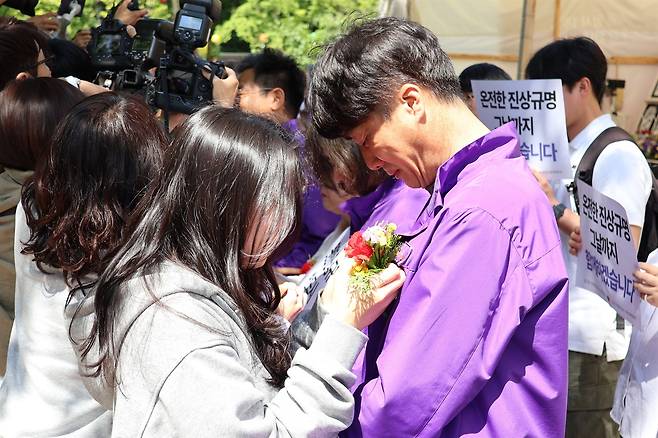 | ▲ 청년·대학생들의 카네이션 선물에 화답하던 이성환 씨(고 이상은 씨의 아버지)와 이태원 참사 유가족들이 눈물을 흘렸다. |