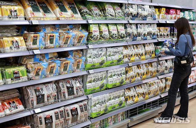 [서울=뉴시스] 이영환 기자 = 8일 오전 서울의 한 대형마트에 김 제품들이 진열돼 있다.