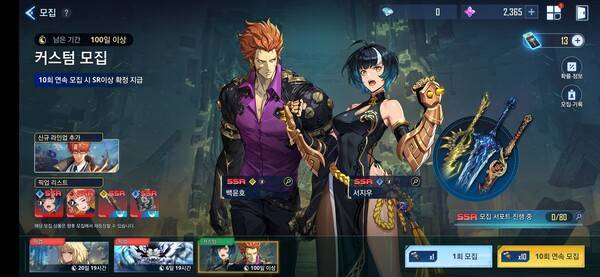 게임을 다시 켜면 바로 튜토리얼 스킵이 가능하다. 업적 탭에서 모두 획득을 눌러 모집권과 재화를 획득하고 모집 탭으로 들어간다. 픽업 리스트 선택이 가능한 커스텀 모집에서 서지우와 엠마, 킬더울프와 테티스의 마도서를 선택 후 20회 모집을 진행한다.