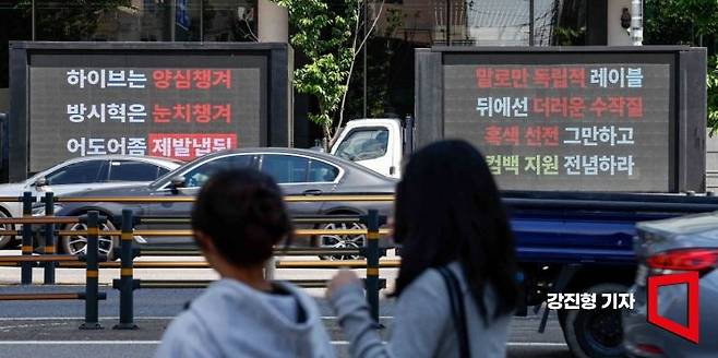 어도어 민희진 대표가 하이브를 상대로 의결권행사금지가처분신청을 내며 하이브와 민 대표의 갈등이 이어지고 있는 8일 서울 용산구 하이브 사옥 앞에 뉴진스 팬덤 버니즈가 모금을 통해 트럭 시위를 진행하고 있다.