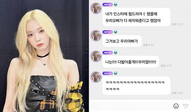 윈터는 8일 유료 소통 플랫폼 버블을 통해 팬들과 이야기를 나눴다. 대화를 나누던 중 윈터는 "내가 인스타에 힘들다 했을 때 우리 오빠가 다 해치워준다 하지 않았냐"며 최근 화제가 됐던 친오빠와의 우애를 언급했다. 윈터가 SNS에 "힘들다"는 글을 남기자 오빠는 "왜 힘들어 톨톨아ㅜㅜ 오빠가 다 해치워줄게"라며 든든한 응원 메시지를 보냈던 바. 윈터는 "그거 보고 우리 아빠가 나는!!!! 다 밟아줄게!!! 우리 딸!!!!!!!"이라며 아빠에게 받은 응원 메시지도 공개했다.