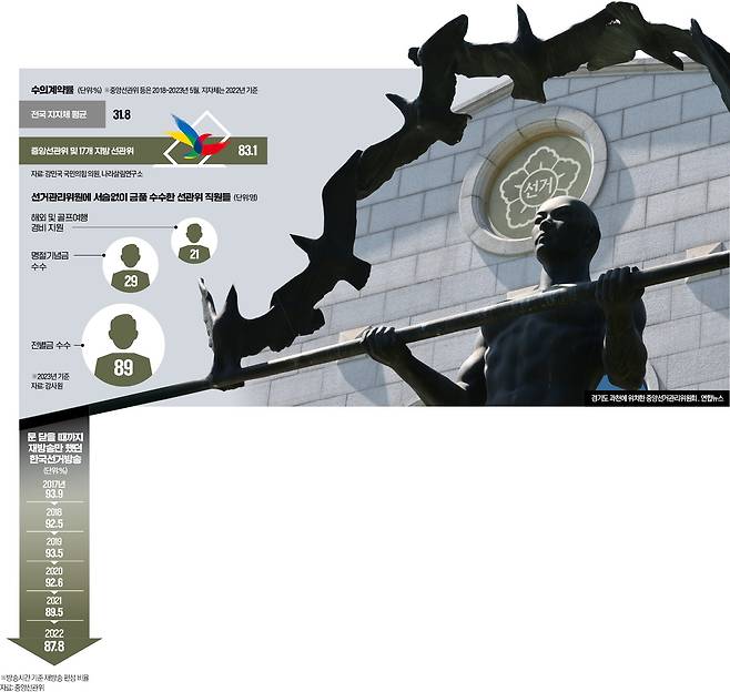 조직 전반에 부패를 막아야 한다는 인식도 옅다. 강민국 국민의힘 의원이 지난해 국정감사에서 공개한 자료에 따르면 2018년부터 2023년 5월까지 선관위는 외부 계약 9354건 중 83.1%인 7774건을 수의계약으로 체결했다. 전국 지자체의 수의계약 비중은 2022년 기준 평균 31.8%에 불과하다.