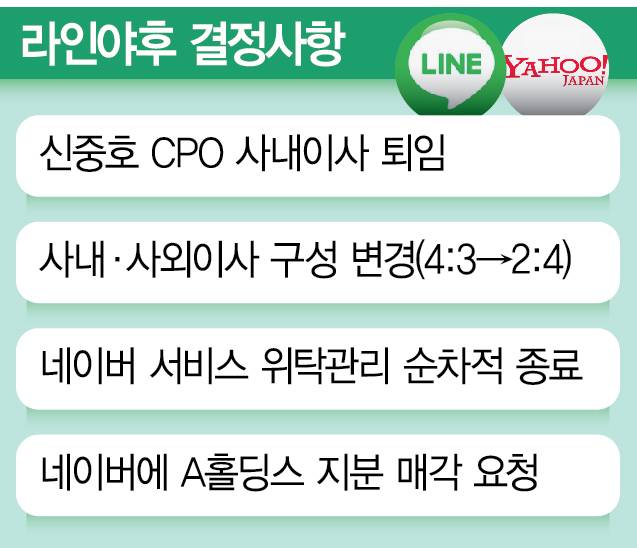 '보안 강화' 명목으로 네이버와의 위탁 관계를 순차적으로 종료하고 라인야후 이사회에서 유일한 한국인 임원이었던 네이버 출신 신중호 라인야후 최고제품책임자(CPO)를 배제하며 이사회를 전원 일본인으로 채웠다.