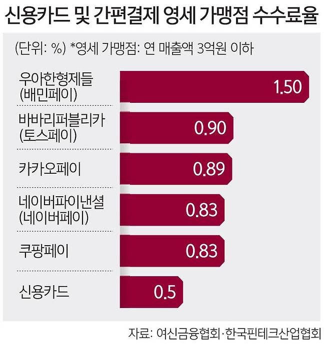이는 간편결제를 거치지 않는 일반 신용카드 수수료율보다 높은 수준이다. 여신금융협회에 따르면 영세 가맹점 대상 신용카드 수수료율은 0.5%다. 체크카드는 0.25%까지 낮아진다.