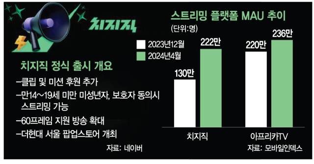 치지직은 오픈 베타서비스를 시작한 후 폭발적인 성장을 이어가고 있다. 모바일인덱스에 따르면 지난달 치지직의 월간 활성화 이용자(MAU) 수는 222만 명으로 베타 테스트를 시작한 지난해 12월(130만 명) 대비 약 70% 늘었다. 최수연 네이버 대표는 3일 2024년 1분기 실적발표 콘퍼런스콜에서 “‘치지직'은 이용자 수를 지속해서 늘려가고 있다”고 밝혔다.